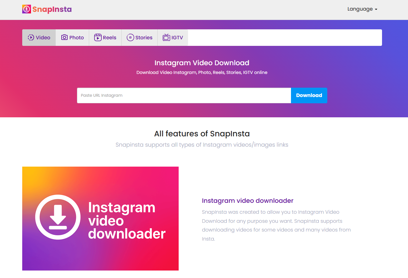 SnapInsta is a versatile online tool designed to allow users to download various types of content from Instagram, including videos, images, stories, and IGTV videos, without requiring any additional software or applications. This user-friendly platform offers a straightforward, free, and fast solution to download Instagram media directly to your device, making it highly convenient for those who wish to save and enjoy Instagram content offline.